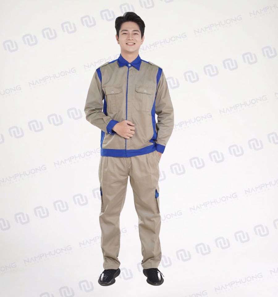 Gấu áo bo chun hai bên giúp ôm gọn cơ thể, tránh vướng víu khi làm việc gần băng chuyền. Quần màu be đồng bộ với áo, có hai túi hộp bên đùi rộng rãi, dễ thao tác, phù hợp đựng điện thoại, chìa khóa hoặc dụng cụ làm việc nhỏ gọn.
