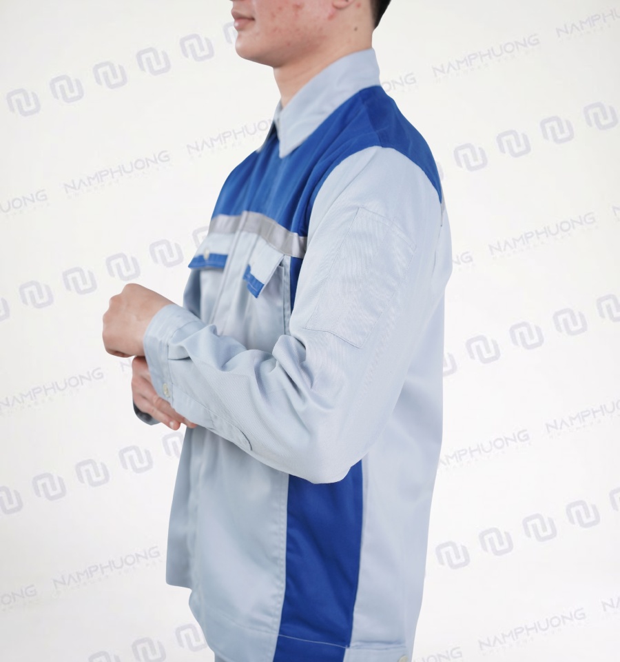Hai túi ngực nắp cúc tiện lợi giúp cất giữ điện thoại, sổ tay hoặc thẻ nhân viên an toàn. Phần phối xanh dương ở ngực và vai tạo điểm nhấn hiện đại, tăng khả năng nhận diện thương hiệu khi may đồng phục số lượng lớn.